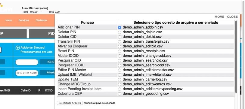 Com o arquivo salvo, você irá acessar o MVNO através do seu login e senha. Em seguida vai na opção Serviços, e escolher a operadora. Vai selecionar a opção Processamento em Lote. Abrirá uma janela igual a esta exibida abaixo. Você irá selecionar a primeira opção (Adicionar PIN), onde já mostra o nome do arquivo salvo a ser exportado.
