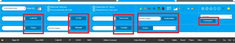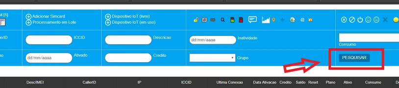 Ao preencher qualquer um dos campos (CallerID, Plano, ICCID, Ativação, Descrição, Credito, Inatividade, Grupo ou Consumo) basta selecionar a opção PESQUISAR, que o sistema irá retornar com o resultado desejado.